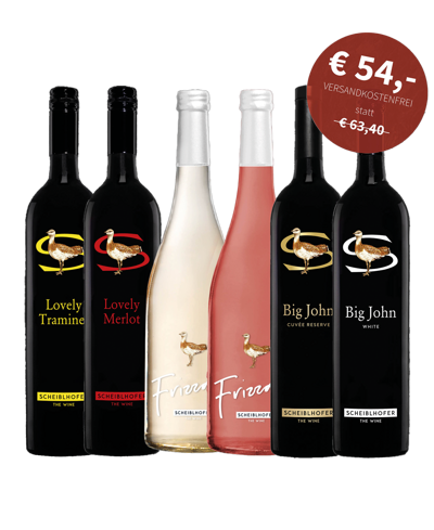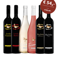 Deswegen haben wir ein exklusives Valentine`s-Package für euch zusammengestellt: Frizzante, Frizzante rosé, Lovely Traminer, Lovely Merlot, Big John und Big John white.