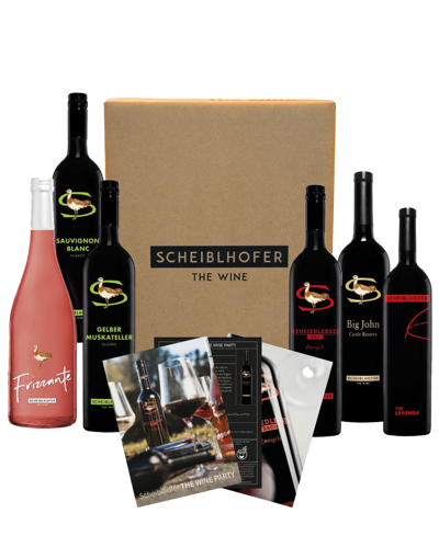 The Wine Party is the complete tasting kit for your home. Six carefully selected Scheiblhofer wines, clear instructions, a dedicated tasting notebook, and the official descriptions by Erich Scheiblhofer turn every tasting into an experience. Ideal for cozy evenings and for anyone who wants to explore wine in a fun and playful way.